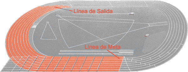 Se arranca al inicio de la curva al finalizar la recta norte, al tener la pista forma de óvalo e ir aumentando la distancia de los carriles del interior al exterior, se hace necesario correr con posiciones demarcadas en lugares diferentes para poder igualar la longitud de cada carril.